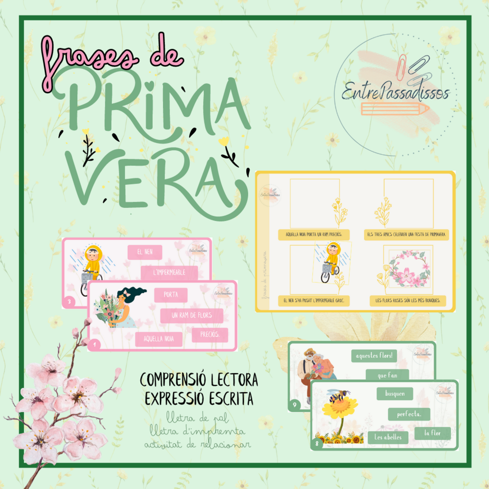Es tracta de 12 targetes diferents de temàtica primaveral on, a partir de les imatges, s'han d'ordenar les frases (pal i impremta). Ho podeu fer de manera oral o escrivint-les.