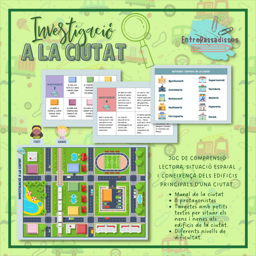 - 4 targetes amb petits textos de diferents nivells i situacions per situar els protagonistes a la ciutat, segons el que fan o la situació espaial que indiquen.
